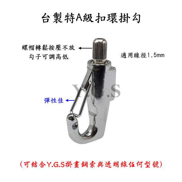 規格: 鋼索長度=1米(100公分), 鋼索線徑=1.5mm, 勾子總長=46mm, 勾子開口=7mm